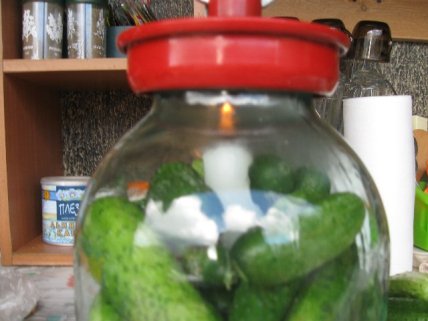 Примерно за полминуты огонь сжигает оставшийся кислород, и свеча тухнет. При таком способе закупорки - сухой консервации - огурцы в прохладном месте могут достоять свеженькими до Рождества.