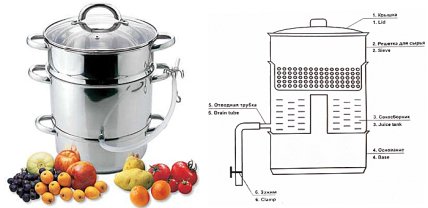 Внешне соковарка представлена набором из нескольких емкостей, которые располагаются одна над другой. В нижнюю часть емкости заливается вода, далее тару помещают на плите и доводят жидкость до состояния кипения. После этого ставят специальную емкость для скопления сока (она отличается трубкой с зажимом для сливания сока), сверху помещают дуршлаг с фруктами или ягодами и накрывают крышкой.