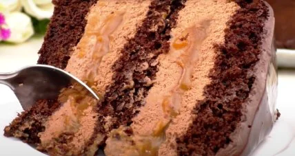 - Сформировать торт, смазывая коржи кремом и карамелью.
