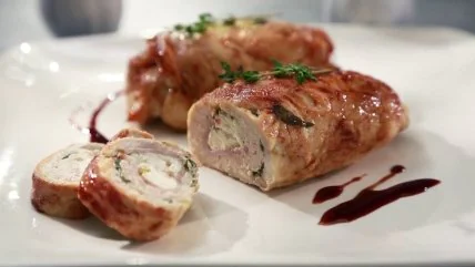 - Распределить сырное пюре на куриных пластах, тщательно скрутить их и закрепить с помощью зубочистки.