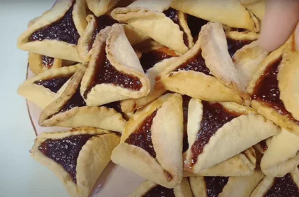 - На пирожные выкладываем по чайной ложке повидла. Формируем треугольнички, как показано на видео. Выкладываем пирожные на противень и выпекаем при 180°C 10-15 минут (до румяного цвета).