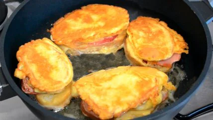 5.Готовить на среднем огне пока сыр не расплавится, а яйца не станут золотистыми.