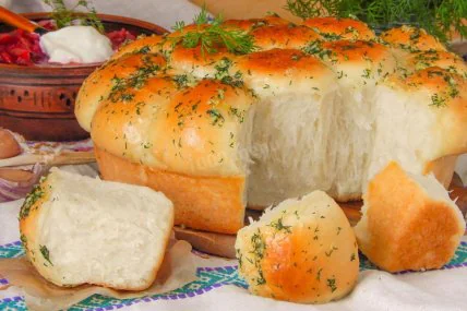 8.Достать пампушки, накрыть полотенцем на 5 минут, разломать и полить заправкой.