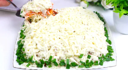 Этот салат "Белый принц" выкладывается слоями, поэтому он выглядит нарядно. Как рассказали на ютуб-канале "Блюда на Все Вкусы", приготовить его несложно. Но вкусно так, что гости попросят этот салат с собой.
