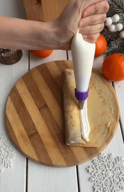 7.Выложить творожную начинку и завернуть блинчик до конца.