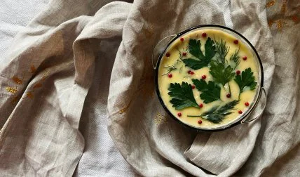 - Для апельсинового масла снимаем цедру с апельсина. В сотейнике растапливаем масло, добавляем цедру и тимьян. Несколько минут провариваем на маленьком огне и процеживаем через сито.