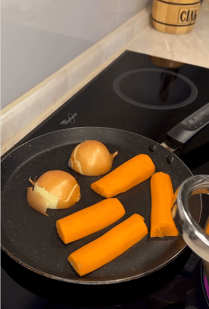 2.Поджарить морковь и лук, разрезав пополам, при этом не снимая луковицу с лука. Стебель сельдерея разорвать в куски и также добавить в бульон.