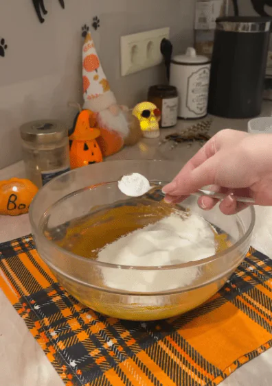 2.Добавить к тыквенному пюре яйца, сахар, масло, и все перемешать.