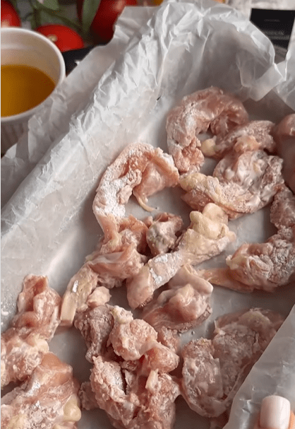 2.Выложить на противень, застеленный пергаментом. Важно, чтобы кусочки свободно лежали на противне и не слипались.