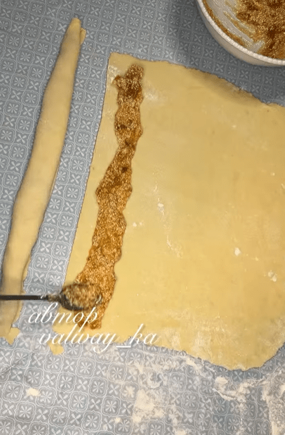 5.Тесто раскатать в тонкий слой. Выложить начинку на край теста и завернуть в трубочку.