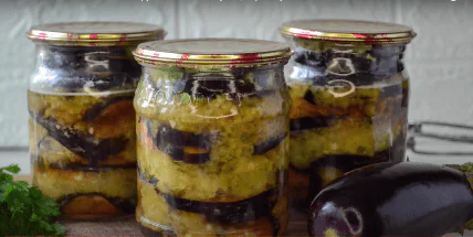 - В стерилизованные банки чередуйте слои обжаренных баклажанов и заправки. Закройте банки крышками и стерилизуйте в воде в течение 10 минут.