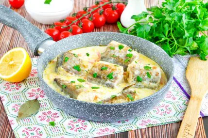 Хек – это недорогая и полезная рыба, которую можно приготовить разными способами: обжарить, запечь или даже сделать по-еврейски с морковью и луком. Сегодня предлагаем нежный и простой рецепт хека в сметанной заливке.