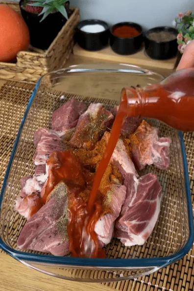1.Мясо нарезать кусочками. Замариновать в специях и соке не менее 2 часов.