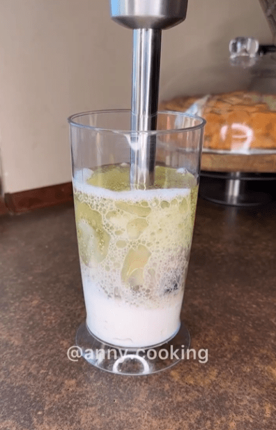 2.Ножи блендера опустить на дно посуды и начать взбивать, плавно поднимая блендер вверх и опуская.