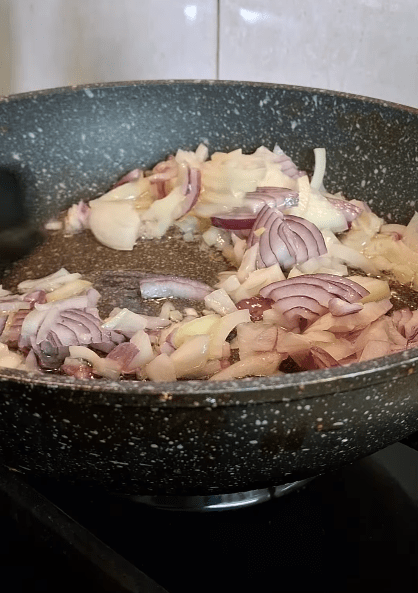 1. Лук нарезать полукольцами и обжарить.