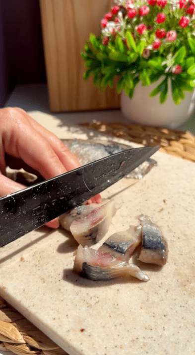 1. Селедку разберите на филе и нарежьте на кусочки.