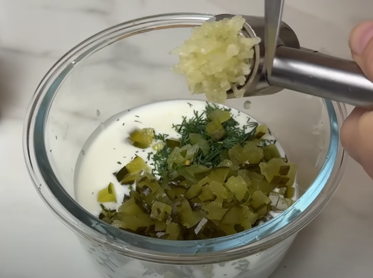 Пока тесто настаивается, приготовьте соус. К йогурту добавьте измельченный соленый огурец, 1-2 измельченных зубчика чеснока, оставшийся укроп, щепотку соли, перца и столовую ложку оливкового масла. Перемешайте все до однородности.