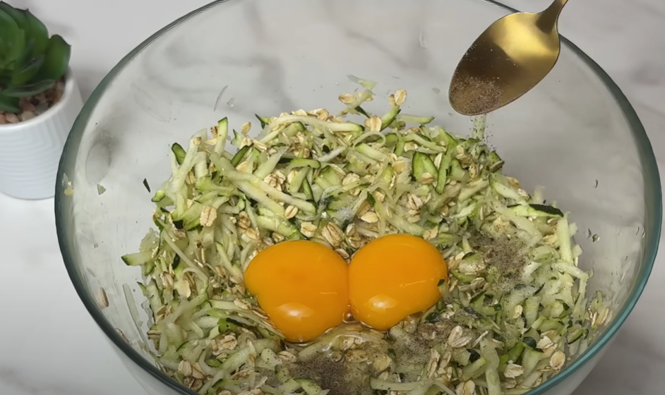 Добавьте в кабачково-овсяную смесь два яйца, соль, черный молотый перец и половину измельченного укропа. Тщательно перемешайте и оставьте на 15 минут, чтобы овсянка хорошо набухла, а масса достигла нужной консистенции.
