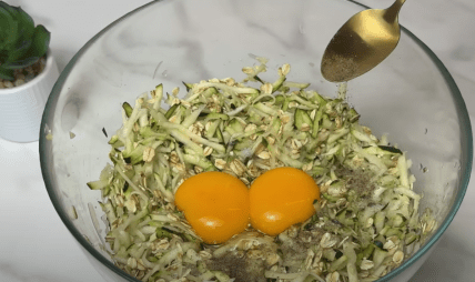 Натрите один средний кабачок на большой терке, не отжимая сок. Добавьте к натертому кабачку стакан овсяных хлопьев и хорошо перемешайте, чтобы овсянка впитала жидкость.