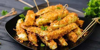 - Обсушить кабачки, обвалять каждый брусочек сначала в муке, затем в яйце, а затем в панировочной смеси.
