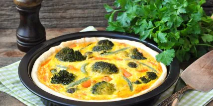 - Залить овощи яичной смесью и запекать 30–35 минут при температуре 190 градусов до румяной корочки.
