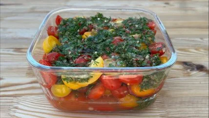 4. Накройте емкость и поставьте в холодильник на ночь. Закуска промаринуется и помидоры пустят сок. Утром блюдо будет готово к употреблению.