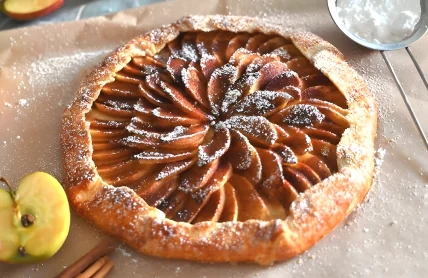 - Достаньте тесто из холодильника и раскатайте его в неровный круг прямо на противне. Выложите в середину ломтики яблок, оставив по краям 4–5 см свободными.