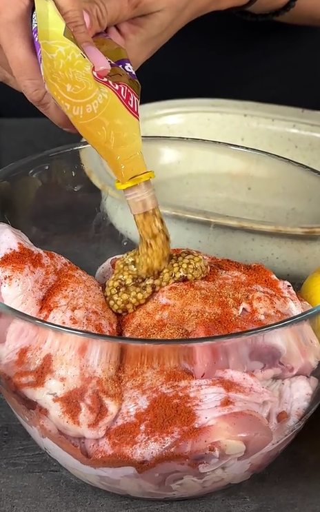 - К подготовленным куриным четвертинкам добавляем горчицу, сок лимона, выдавленный через пресс чеснок и специи. Хорошо перемешиваем