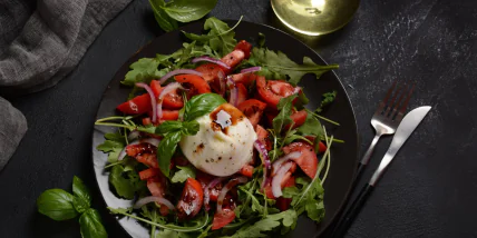 Салат с итальянским сыром бурата и помидорами, идеален для быстрого перекуса или легкого обеда
