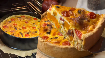 5. Разогрейте духовку до 180°C. Выпекайте киш 40-50 минут, пока заливка не загустеет, а тесто не станет золотистым.