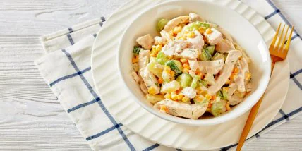 - В большой миске соединить курицу, капусту, кукурузу и яйца, добавить соус и перемешать.