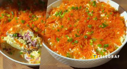 - Сверху выложить натертую на мелкой терке отварную морковь. Смазать заправкой.