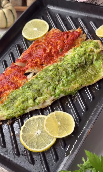 6. Перевернуть. Одну половину рыбы смазать красной сальсой, вторую – зеленой.
