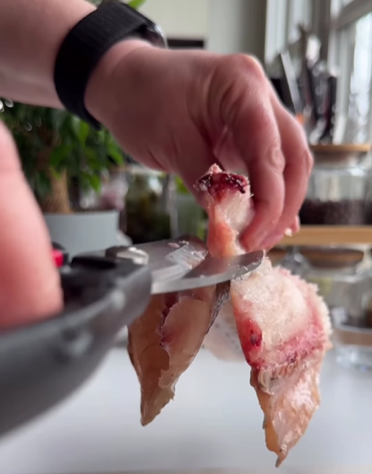 2. Ножницами вдоль позвоночника подрезать ребра, а затем ножом осторожно отделить мякоть от позвоночника до хвостика, не повреждая кожуру.