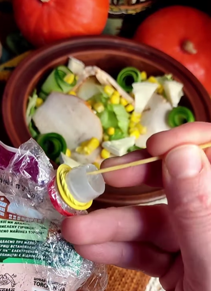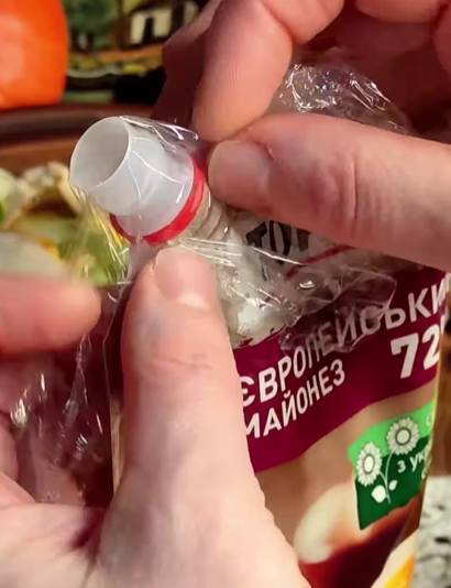 Фудблогер с ником bude_smachno_razom в Instagram поделилась простым и эффективным способом решить эту проблему с помощью подручных средств. Для нанесения аккуратной майонезной сеточки понадобится пищевая пленка, резинка и зубочистка.