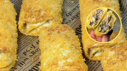 - Каждый рулетик обваляйте сначала во взбитом яйце, а затем в сухарях панко, выложите на застеленный пергаментом противень.