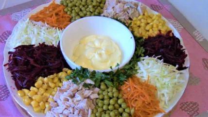 Новогодняя "Радуга": простой салат, который исчезает со стола первым (видео)