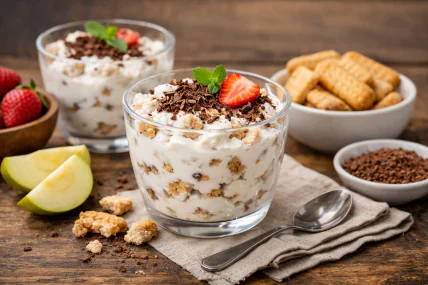 Десерт подают хорошо охлажденным, порционно в стаканах или креманках. Для украшения можно добавить тертый шоколад, какао, ягоды или тонкие ломтики яблока. Он хорошо сочетается с кофе, чаем или легким фруктовым соусом. При желании печенье можно заменить на гранолу или бисквитные крошки для другой текстуры.
