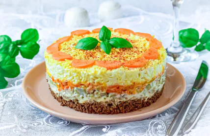 5. Формировать салат слоями в форме или кольце: первый слой – печень + майонезная сеточка; второй — зажарка из овощей; третий – маринованные огурцы; четвертый – натертые вареные яйца + майонез.