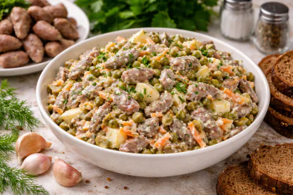 - Вариации: майонез можно заменить густым греческим йогуртом или смесью йогурта с горчицей, а вместо горошка добавить консервированную кукурузу или фасоль.