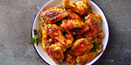 5. Повысить температуру до 220 °C или включить режим гриля на 3–5 минут, смазав крылышки остатками маринада.