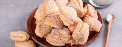 - Обмакнуть каждый кружочек в сахар с одной стороны, сложить пополам сахаром внутрь, снова обмакнуть одну сторону и еще раз сложить, формируя треугольник.