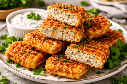 Вафельные котлетки лучше подавать горячими, сразу после жарки, чтобы сохранить хрустящую корочку. К блюду хорошо подходит картофельное пюре, отварной рис или легкий овощной салат. В качестве соуса подойдет сметанный с зеленью, чесночный или томатный. Для подачи можно посыпать мелко нарезанной зеленью или подать со свежими овощами. Кушанье сочетает простоту приготовления, бюджетность и выразительный вкус, поэтому легко станет любимым вариантом для семейного ужина.