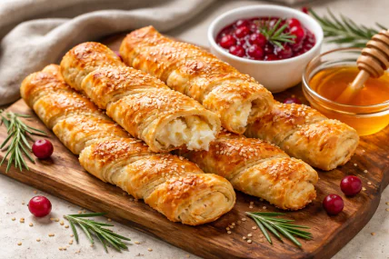 Горячие рулеты подавать с медом, клюквенным соусом или другим фруктовым джемом. Можно сочетать с чаем или кофе на завтрак или полдник, а также как легкую закуску на фуршете. Для праздничного стола красиво выложить на деревянной доске или на большой тарелке, украсив свежей зеленью или ягодами.