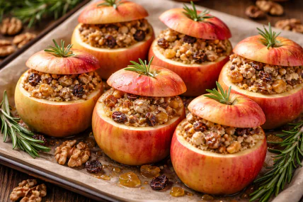 Запеченные яблоки – блюдо, имеющее давнюю домашнюю кулинарную традицию во многих европейских кухнях. Их готовят как легкий десерт или тёплую закуску, наполняя сухофруктами, орехами или медом. Начинка из халвы придает карамельную сладость и нежную, слегка кремовую текстуру, которая хорошо сочетается с мягкой мякотью печеных яблок. Для лучшего вкуса следует выбирать плотные кисло-сладкие яблоки – они держат форму во время запекания и не превращаются в пюре. Изюм должен быть мягким и ароматным; если они суховаты, их лучше запарить. Грецкие орехи желательно слегка подсушить на сухой сковороде – так их вкус станет более выразительным.