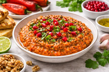 Закуску из печеных перцев лучше подавать охлажденной или комнатной температуры, намазывая на подсушенный хлеб или подавая как соус-дип. Она хорошо сочетается с мясными блюдами, сырной тарелкой или запеченными овощами. Для подачи следует добавить зерна граната, листья кинзы и немного черного кунжута – это подчеркнет как вкус, так и вид. Также можно дополнить блюдо несколькими каплями ароматного оливкового или гранатового соуса.