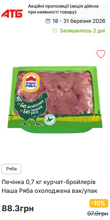 Кстати, приготовить этот салат сейчас еще выгоднее, потому что куриную печень можно купить по акции в супермаркетах "АТБ" — цена снизилась на 10%, и теперь она стоит 88,3 грн. за 700 г вместо 97,9 грн.