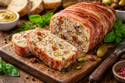 Мясной террин лучше всего подавать охлажденным, нарезанным тонкими ломтиками, чтобы хорошо читалась структура мяса и вкрапления фисташек и томатов. Идеально сочетается со свежими салатами, зерновым хлебом или гренками, а также легкими горчичными или ягодными соусами. Для праздничной подачи блюдо можно дополнить маринованными овощами, микрогрином или каплей бальзамического крема, подчеркивающего вкусовую глубину террина.