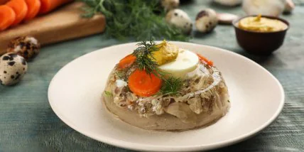 Холодец лучше подавать хорошо охлажденным, в порционных формах или нарезанным на аккуратные куски. Классическим дополнением является горчица, хрен или домашний чесночный соус, подчеркивающий нежность мяса. Для подачи можно использовать свежую зелень, тонко нарезанную морковь из бульона или несколько капель лимонного сока для баланса вкуса. Кушанье хорошо сочетается с черным хлебом или ржаными тостами и часто подается как холодная закуска к праздничному столу.
