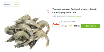 С 22 по 28 апреля 2026 года в супермаркете "Auchan" действует выгодное предложение на креветки "Эквадор" в свежемороженой панцире: вместо 517,4 грн их можно приобрести за 435 грн (скидка -16%). Такой продукт идеально подходит для скорых блюд в средиземноморском стиле, где главную роль играет натуральный вкус морепродуктов. Сегодня предлагается приготовить креветки в медовом соусе – простое, но эффектное блюдо, позволяющее максимально раскрыть их сочность и нежность.